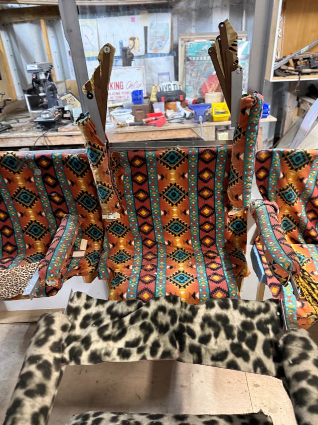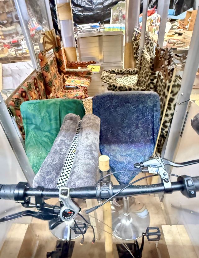 The wheels are all linked together so that when facing the six-foot side, with the pedaler steering, all the wheels turn together. When facing the 3’ side, the pedaler steers and the back wheels go straight, as in all trikes. Batteries are stored under the vehicle, which can be charged in place or slide out like a drawer and be rapidly replaced. A solar panel acts as a roof as well as a source of power. When an opening above is preferred it can be temporarily stored, with the rest of the body, alongside the wall. The hinges are aluminum, covered by colorful fabric. Closings are Velcro and magnets. Seats are well cushioned and sprung, mounted on tubes that are anchored to the floor. They can be adjusted for height and face any direction, as well as be tilted, to allow for the most comfortable, supported, standing/leaning posture, or made level. Drive wheels are under polycarbonate covers, both for passenger safety and comfort and to maximize weatherization when enclosed. These structures are part of the wheels’ “forks”, turn with them and help stabilize them.